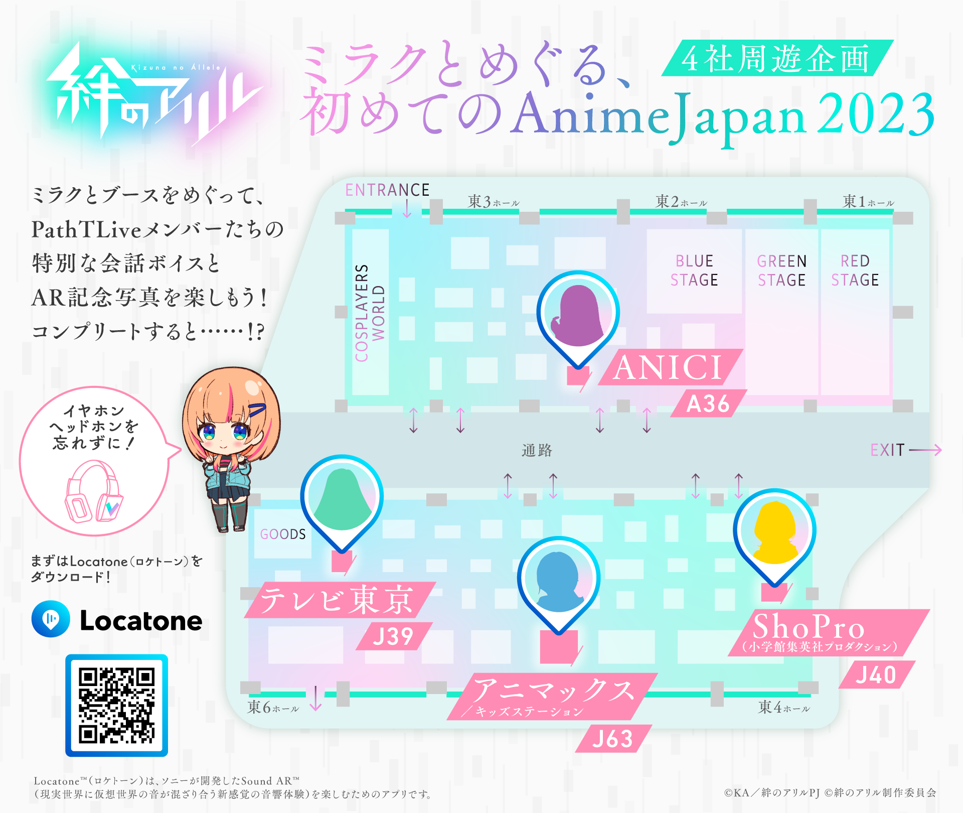 スマートフォンアプリ「Locatone™(ロケトーン)」を使い、「絆のアリル」関連ブースにいる「PathTLive」メンバーに会いに行くと、メンバーたちの会話が楽しめ、ARカメラでメンバーのちびキャラと写真を撮ることができます。さらに、5人全員に会うことができたら特別な画像をプレゼント。ぜひ会場で体験してみてください。