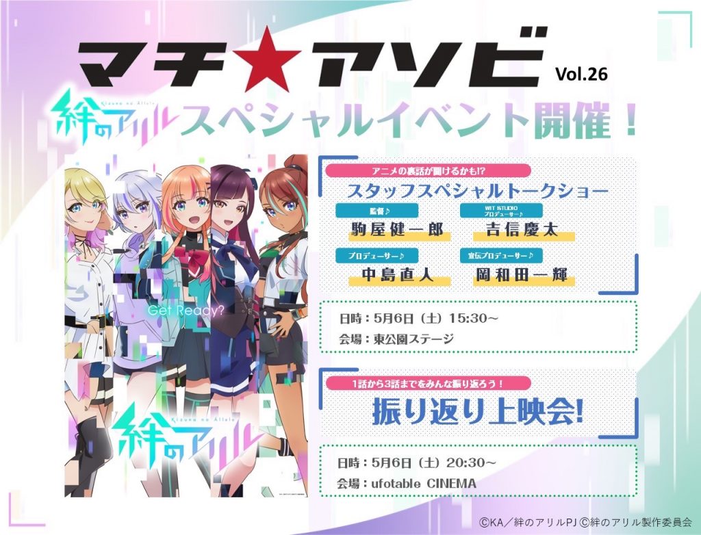 2023.04.21 マチ★アソビVol.26参加決定! 5月6日(土)~7日(日)開催の徳島マチ★アソビイベントに「絆のアリル」の参加が決定しました! 「絆のアリル」スタッフトークショー 日時:5月6日(土)15:30~16:30 場所:東公園ステージ 登壇: 駒屋健一郎(監督)吉信慶太(WIT STUDIOプロデューサー)中島直人(プロデューサー)岡和田一輝(宣伝プロデューサー) 「絆のアリル」3話振り返り上映会日時:5月6日(土)20:00~22:00 場所:ufotable CINEMA シアター1
